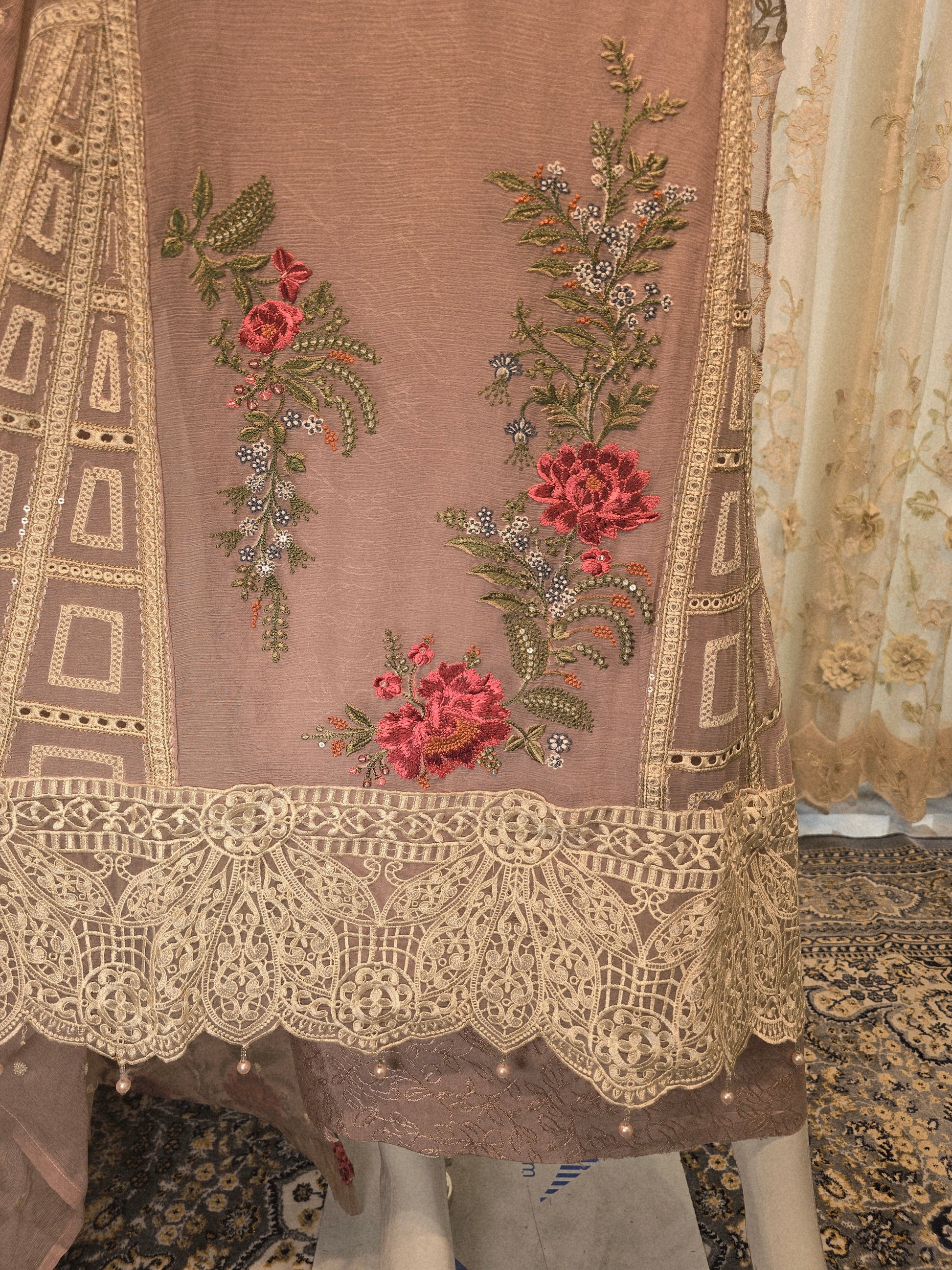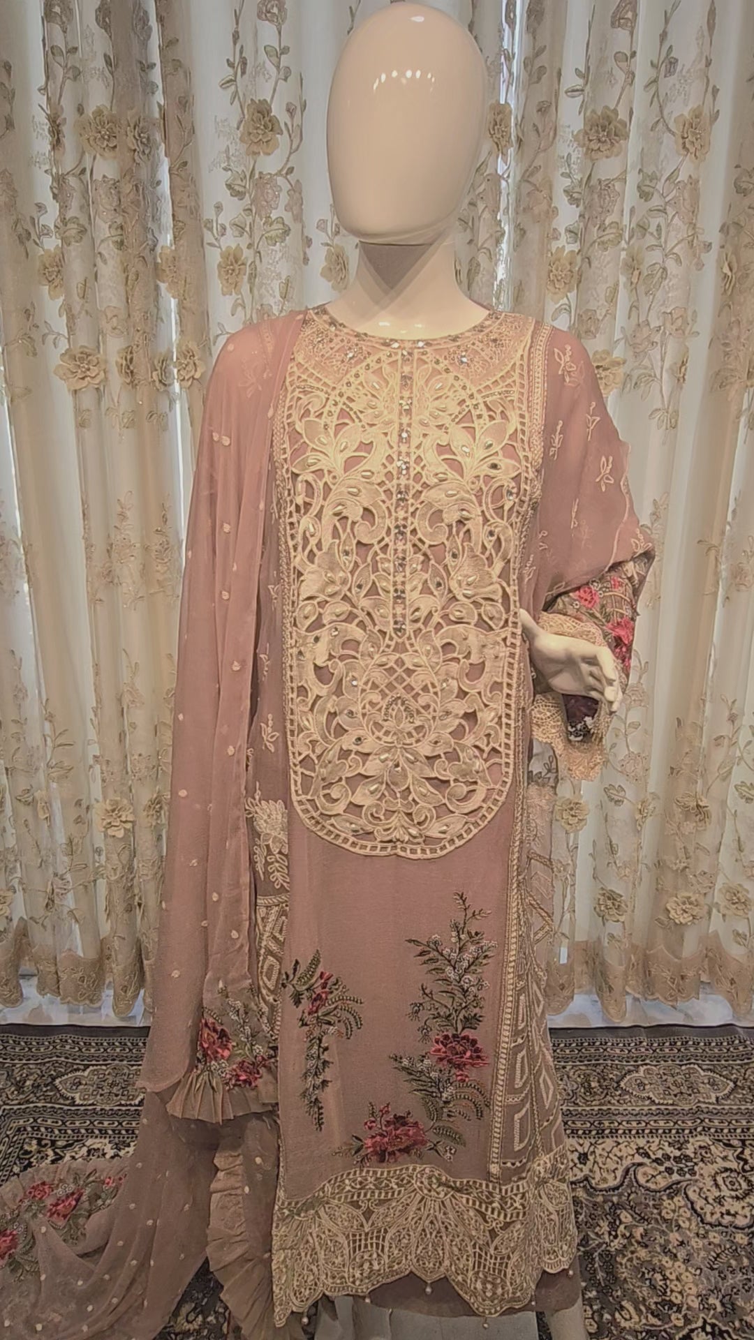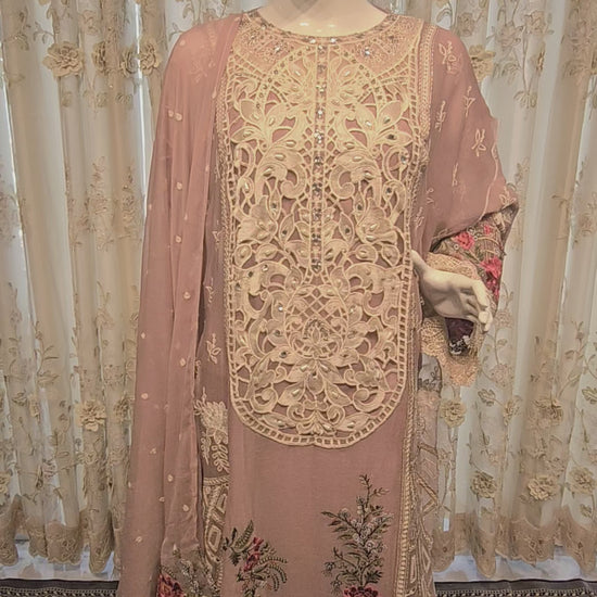 The kurta is crafted from Pure Chiffon, its base color a soft, romantic dusty rose.The most captivating feature is its cutwork detailing embellished with stones and pearls around the hem, neckline, sleeves and dupatta giving it a couture-like edge.
