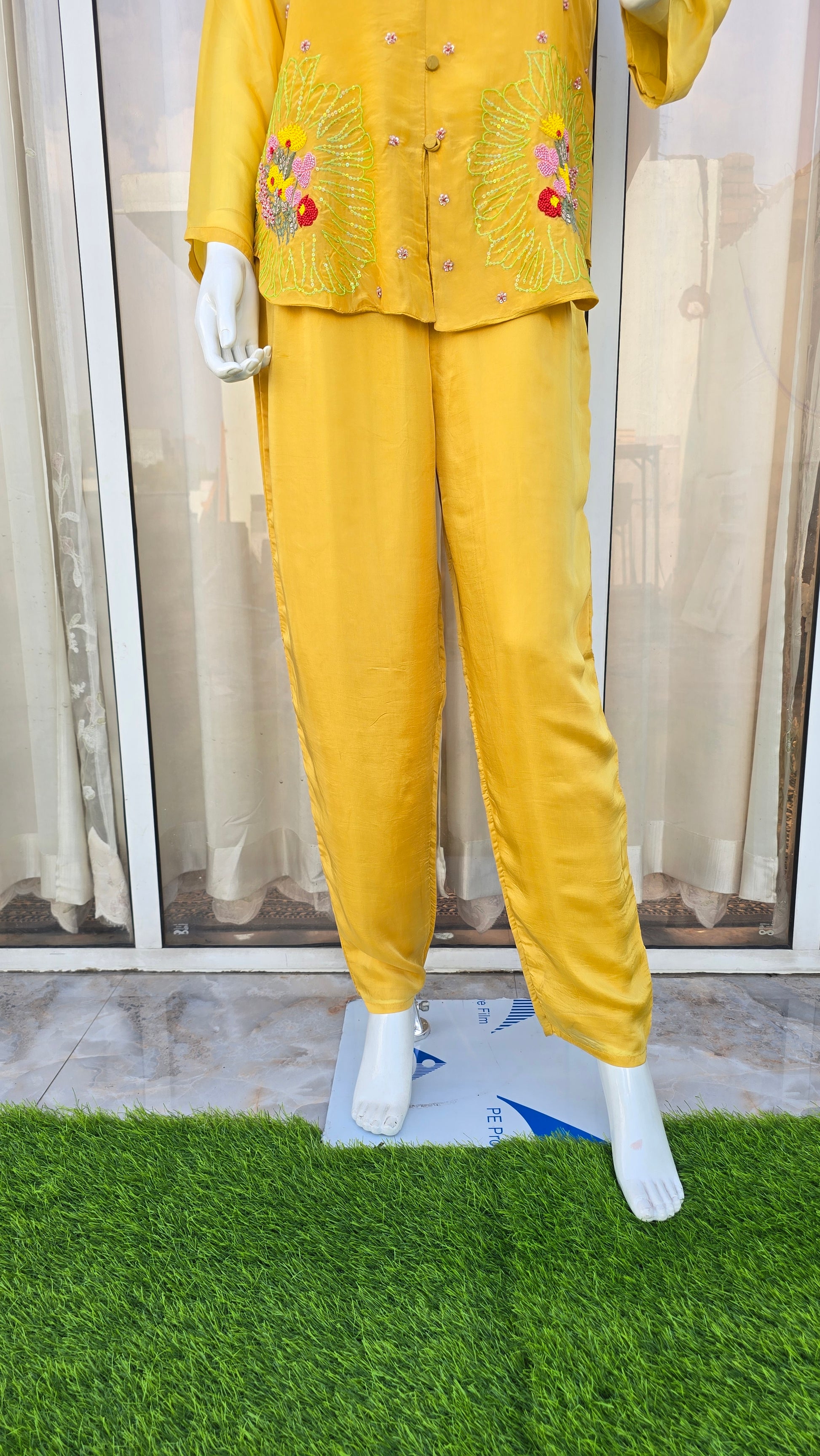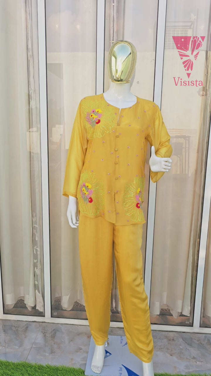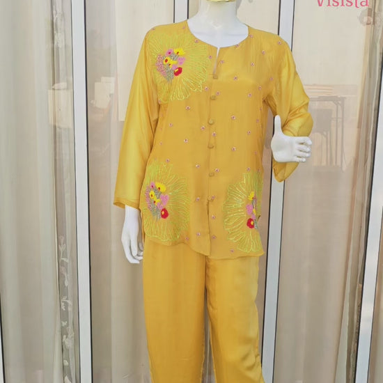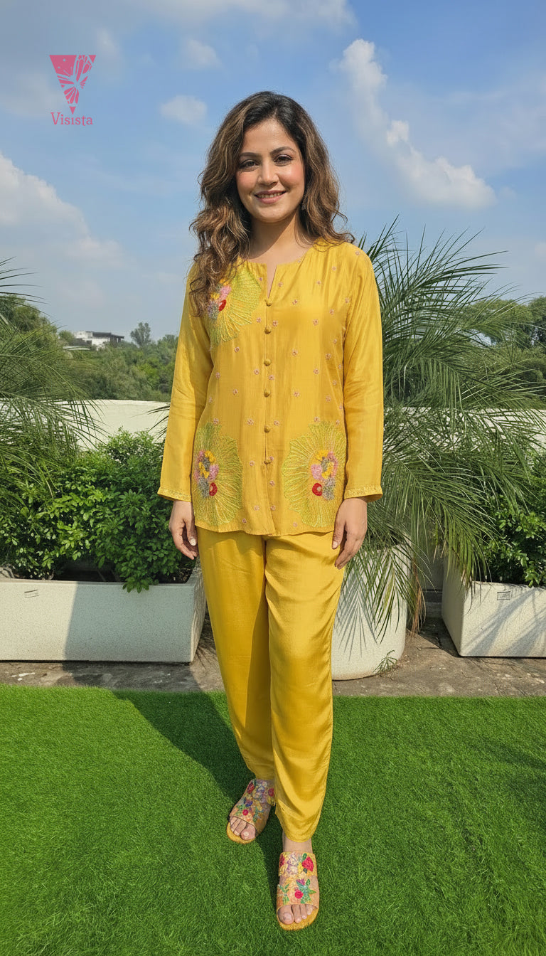 A designer mustard Co-ord in the softest butter muslin, adorned with delicate handwork. Luxuriously lightweight, effortlessly comfortable, and styled to perfection.
